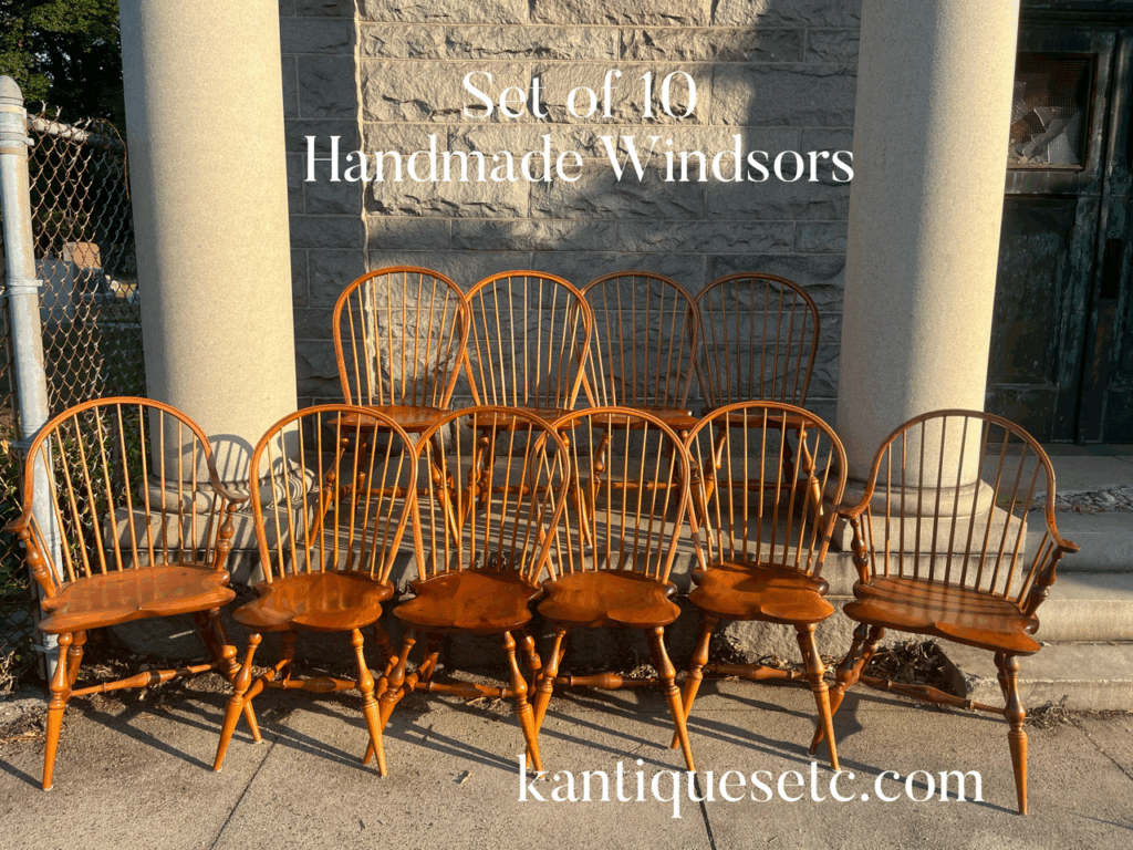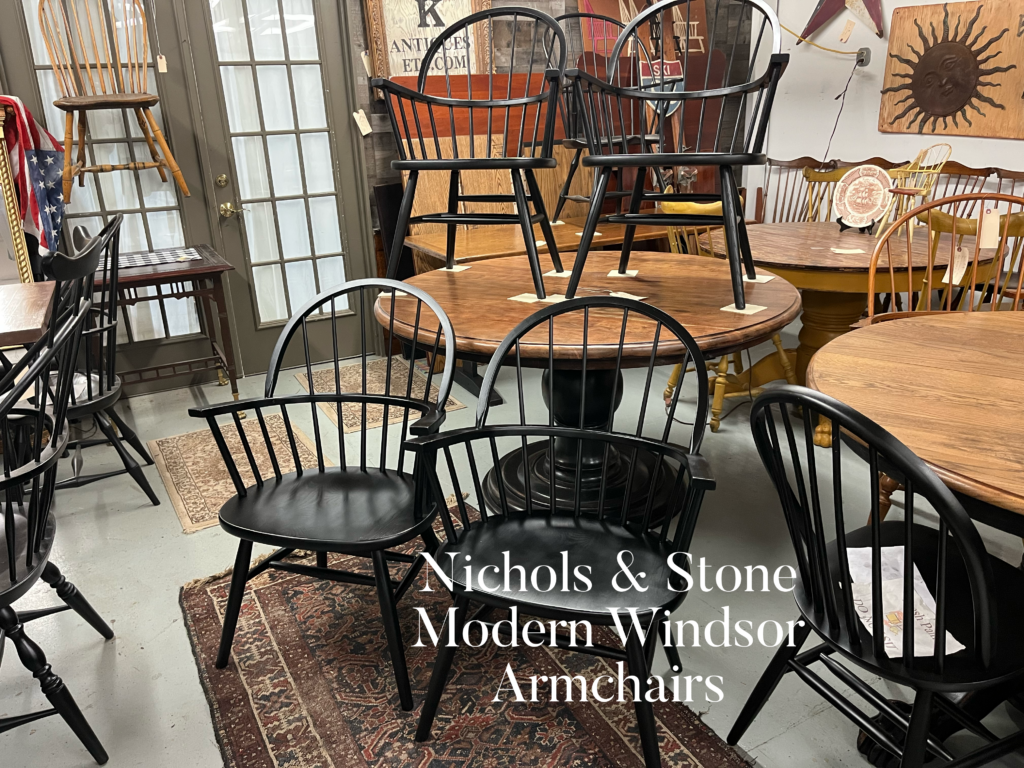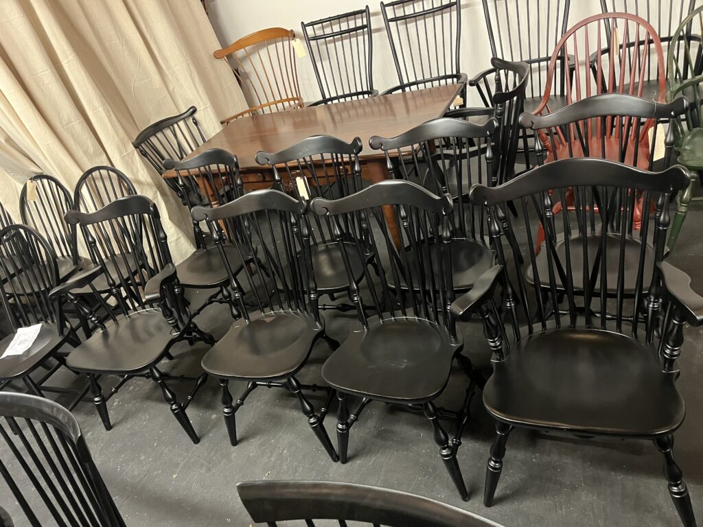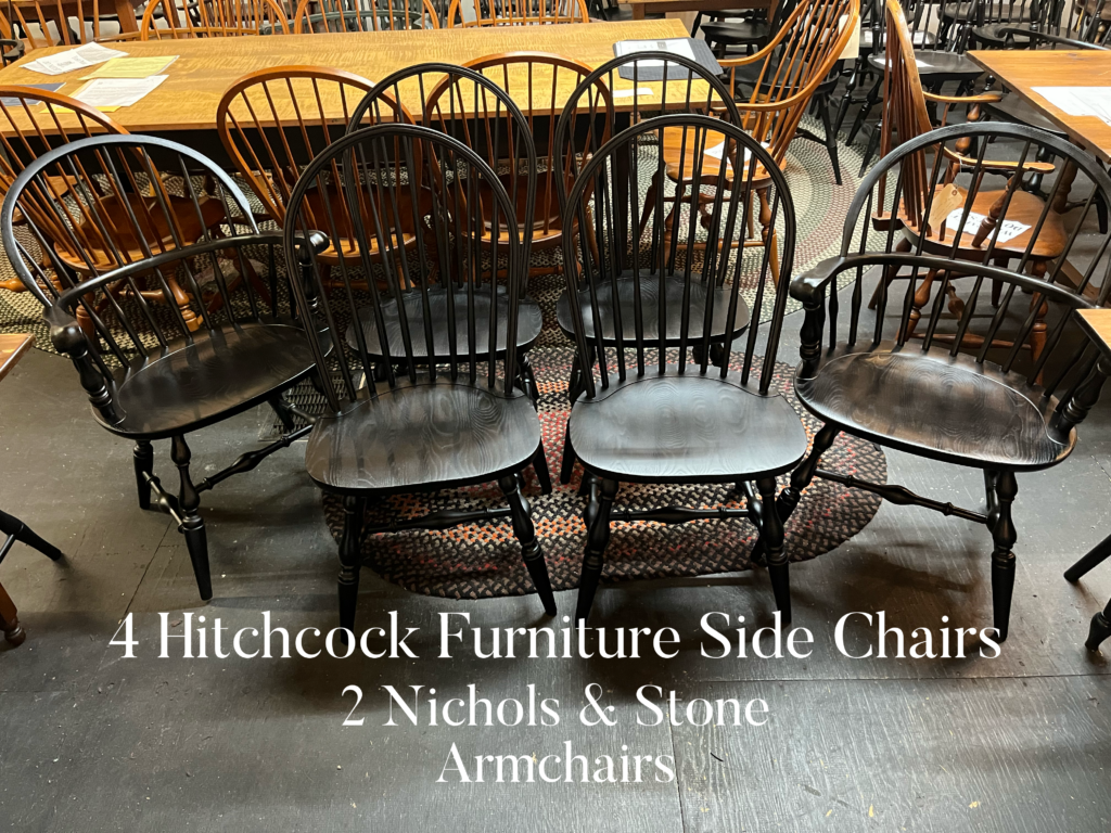 I have, perhaps, the largest curated collection of vintage Windsor chairs in original condition or, restored/painted condition in the region. We offer many styles that will complement your decor ranging from primitive to modern. With my inventory, I am able to offer vintage sets of 8 plus Windsor chairs by many American manufacturers, including but not limited to: D.R. Dimes, Warren Chair Works, LeMieur, Leopold Stickley, Moosehead, Old Hickory, Mitchell, Charles Webb, Hitchcock, E. R. Buck, Nichols and Stone, Heywood Wakefield, Temple Stuart, Hale of Vermont, S Bent Brothers, and Ethan Allen.