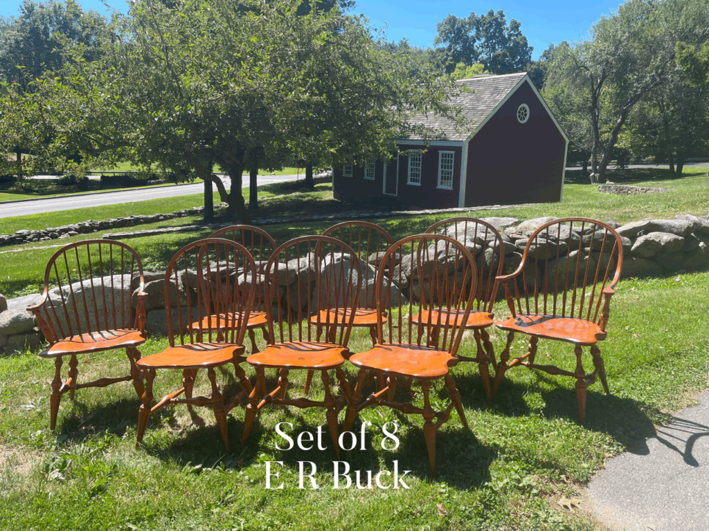 Set of eight Windsor solid Maple dining chairs in original “wheat field” finish by E. R. Buck of Clinton, Massachusetts. Approximate dimensions: armchairs: back height 37 1/2″, arm height 26 3/4″, seat height 18″, width outside arms 24 1/4″, seat width 21″, depth 17″, side chairs: back height 37 3/4″, seat height 18″, back width 20 1/2″, seat width 18 1/2″, depth 17 1/2″. Priced at $2295.00 for the set.