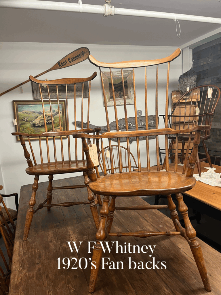 Pair of circa 1920’s Comb back Windsors by W. F. Whitney. Approximate dimensions: height 43″, arm height 27.5″, seat height 18″, width across arms 23.5″, seat width 21″, depth 17.25″. . Offered at $395.00 per chair/pair only