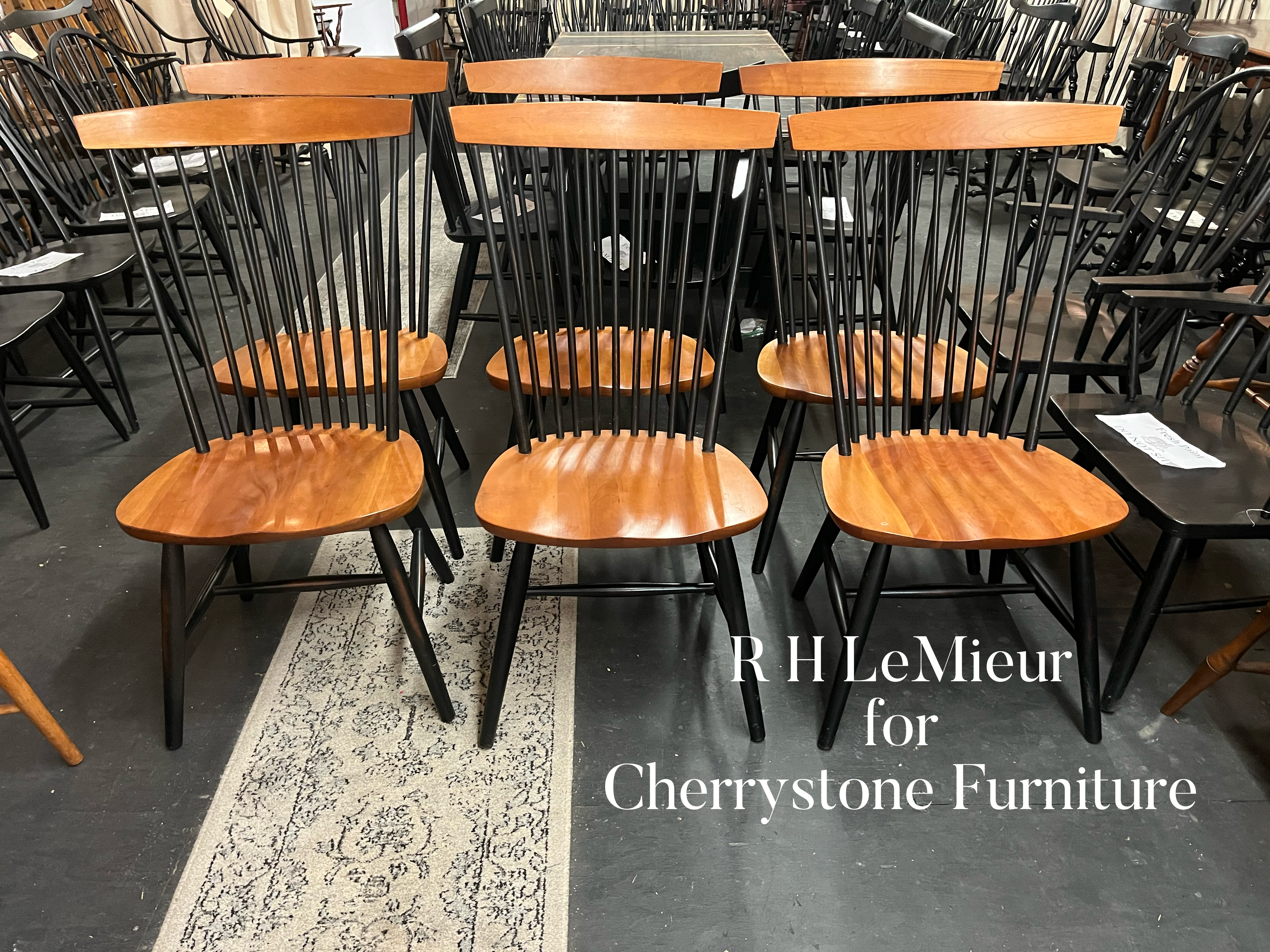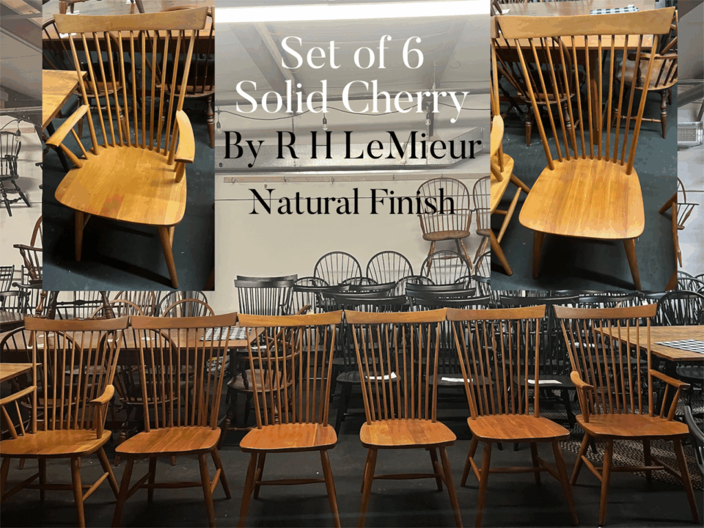 Set of six Cherry Shaker/Modern contemporary Windsor dining chairs manufactured by the now closed R. H. LeMieur of Templeton, MA. R.H. LeMieur furniture was sold through quality furniture retailers such as Crate & Barrel and Cherrystone furniture of Littleton, MA. Approximate dimensions: back height 40″, seat height 18″, back width 23″, seat width 20″, seat depth 17″. Offered at$1,895.00 for the set of six.