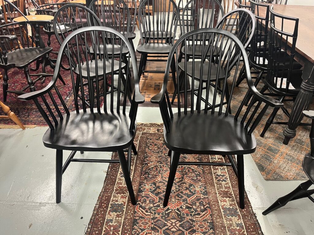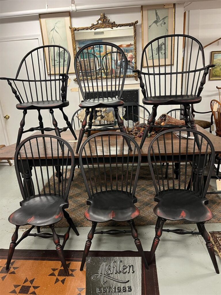 Set of six Windsor dining chairs by Ashlen Furniture, American made in Georgia. Fresh black enamel rubbed into red undercoat. Approximate dimensions: armchairs 40 1/2″ tall, seat height 17 1/2″, arm height 28″, width across arms 27 1/2″, side chairs 39″ tall, 17 1/2″ seat height, 17 1/2″ seat width, 21″ back width. Armchairs offered at $495.00 each, side chairs $395.00 each.
