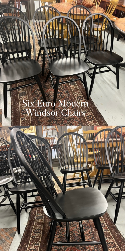 Set of six Euro Modern/contemporary Windsor chairs in fresh black enamel paint. Constructed from strong European beech which is similar to American Birch or Maple. The chairs have dual center stretchers for added strength and stability. These chairs are often used in commercial applications. Approximate dimensions: back height 5.5″, seat height 18″ back width 18.5″, seat width 17.5″, depth 17″. Offered at $195.00 per chair, set of 6 only
