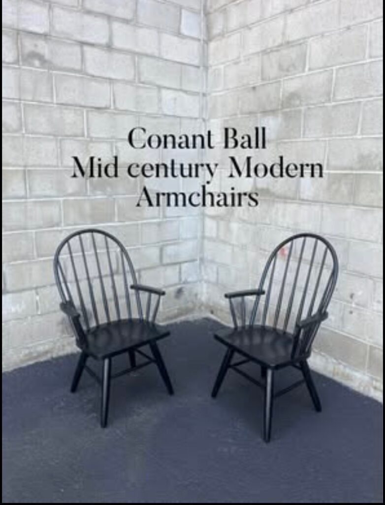 Pair Mid Century Modern Conant & Ball ebonized arm chairs. Approximate dimension: arms -back height 40″, arm height 25.25″, seat height 17.25″, width outside arms 23.5″, seat width 19.75″, depth 17.25″. Arm chairs offered at $250.00 each.