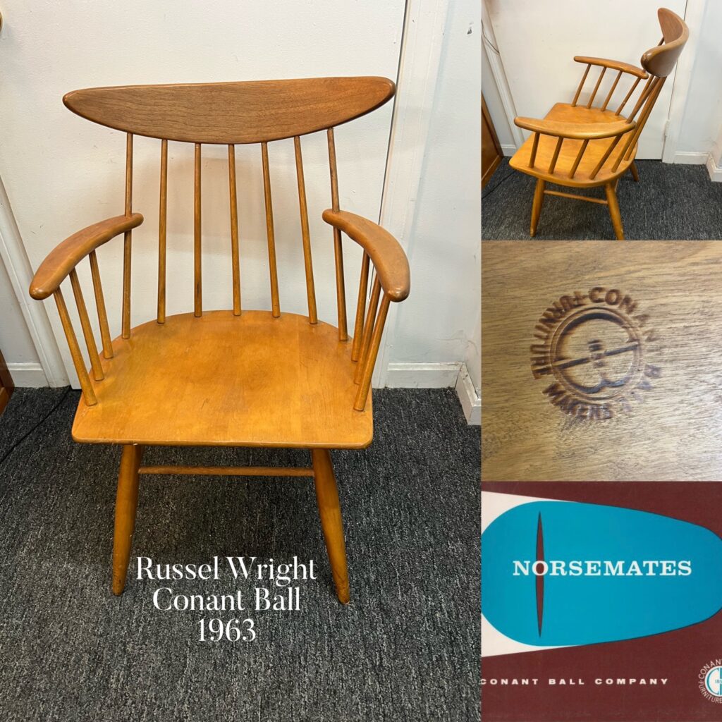 Mid Century Modern arm chair by Russel Wright for Conant Ball. Approximate dimensions: armchairs back height 32″, arm height 25.75″, seat height 17.5″, width outside arms 22.5″, depth 16.5″. Offered at $295.00