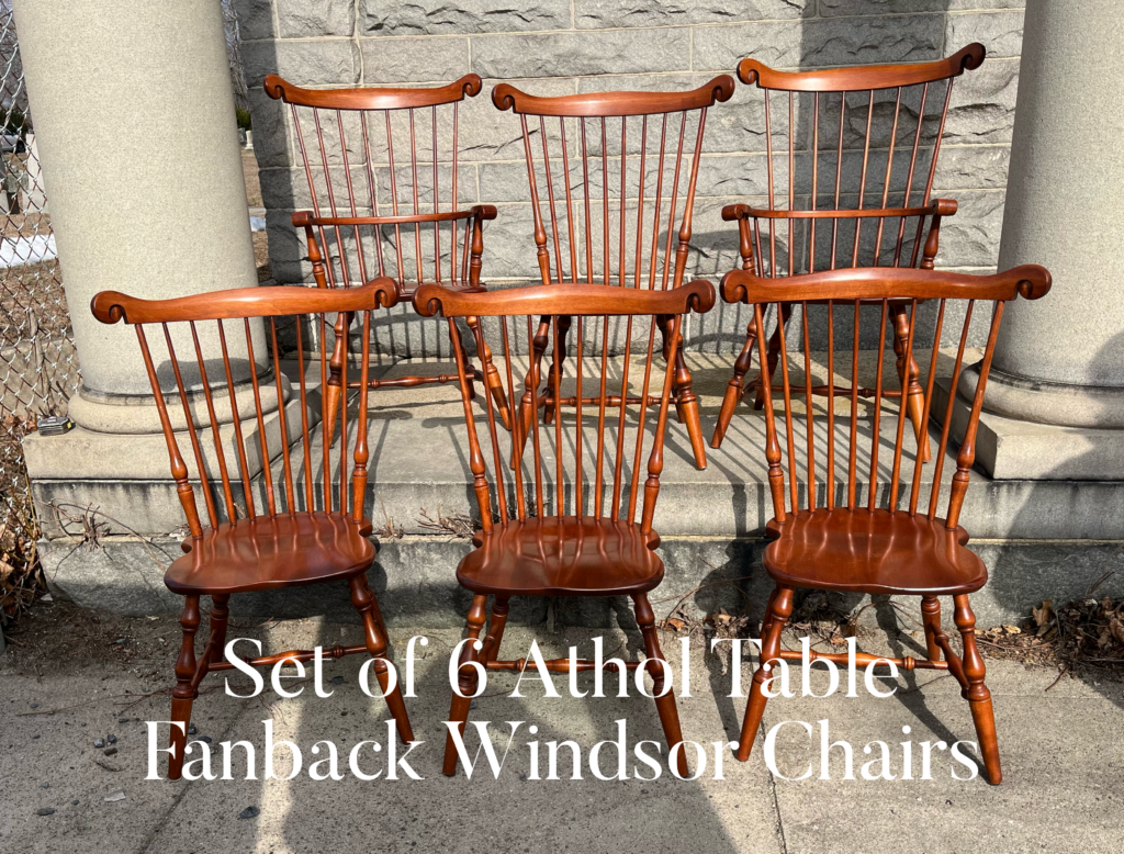Additional set of 6 WCW Warren Chair Works of Warren Rhode Island hand made fan back Windsor chairs with shield seats and hand carved volutes or ears. Set consists oft arm chairs and four side chairs. Armchairs measure approximately 42″ tall, arm height 26″, seat height 17 3/4″, side chairs measure approximately 38″ tall, Armchairs priced at $695.00 each, side chairs $475.00 each/set only. (our price is $5,400.00 less than they are currently being sold for new.)